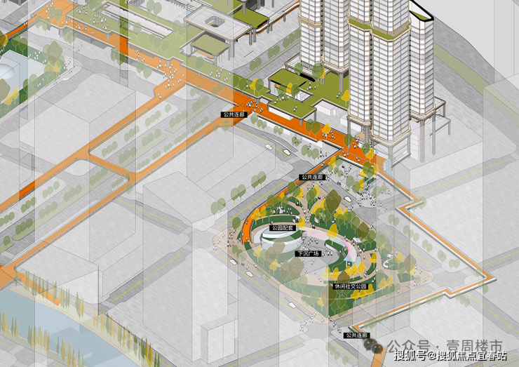 创新功能包括:架空层植入泳池与全龄活动区、避难层改造为观景会所、高空连廊嵌入社交空间。塔楼顶部规划直升机停机坪,地下车库预留智能驾驶车道,实现地面至空域的立体通行。商业底商设计为玻璃格子街铺,类似深圳湾1号,引入轻奢品牌。项目还融入生态连廊系统,连通人才公园及周边配套,并采用分级管控策略:内部庭院封闭管理,外围与城市融合。