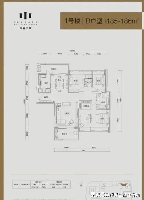 B户型:185-186㎡3房2卫,套内面积约146㎡,动静分区,南北通透双阳台,北向可看香蜜公园景观。