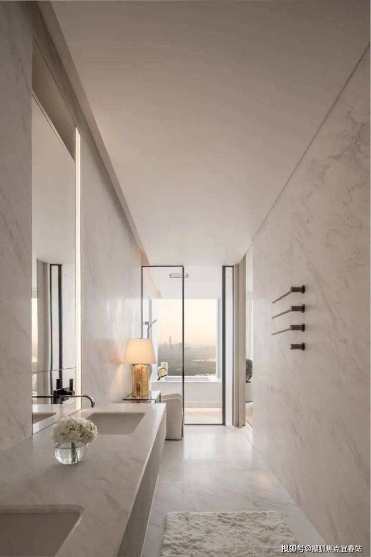 浴缸与休息区共享迷人的城市峡湾景观,白色大理石与镜面设计无现扩大了空间的通透性与流动性。步入式衣帽间复合了储存、展示、收藏和化妆功能,既实用又美观。