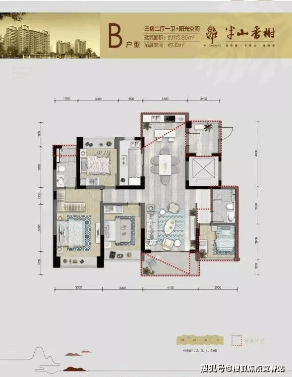 B户型115.86㎡ 赠送约30㎡ 四房二厅二厨二卫