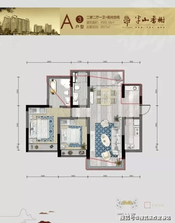 A3户型85.18㎡ 赠约17㎡ 二房二厅二卫