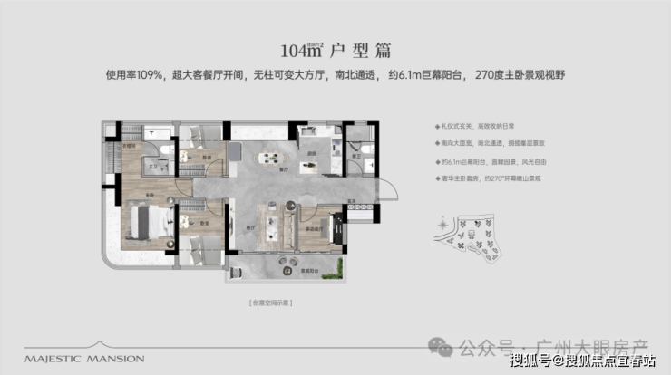 【100㎡四房两厅两卫】:西南向,使用率109%,南北通透,约6.1米巨幕阳台,主卧270°主卧弧形玻璃幕窗。