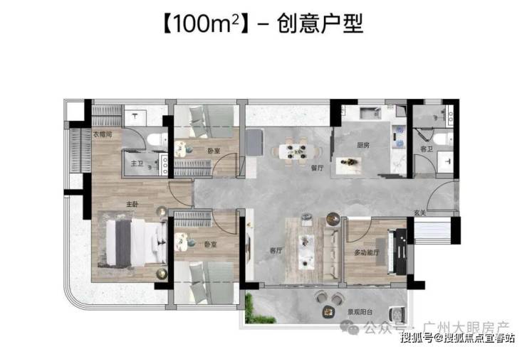 【80㎡三房2厅2卫】:东南向,使用率107%,四开间南向,12.6米超大面宽,主卧270°弧形玻璃幕窗。