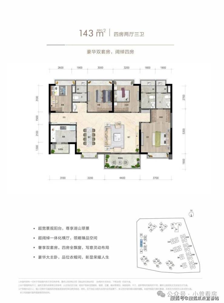 约143㎡四房两厅三卫:豪华双套房,阔绰四房