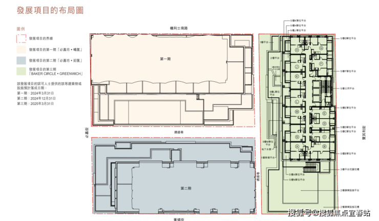 项目分三期发展,由9座住宅大楼组成,全盘共约2,800伙。第三期必嘉坊·Greenwich建有1栋住宅大厦,共提供278伙。主打一房户型,提供163伙,另有65伙开放式、44伙两房和5伙三房及1伙四房单位。