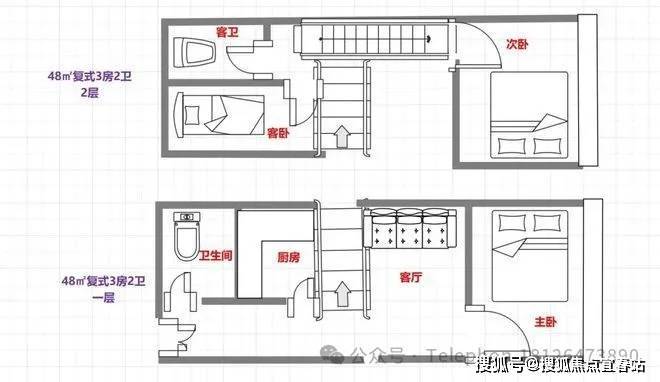 48㎡㎡3房2卫