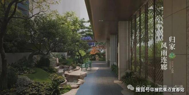 风雨连廊的链接,如一条串联绿城生活的珍珠项链,在“流光溢彩”的氛围中,将绿植水景、休憩平台一一相连,塑造移步异景的立体生态廊道。