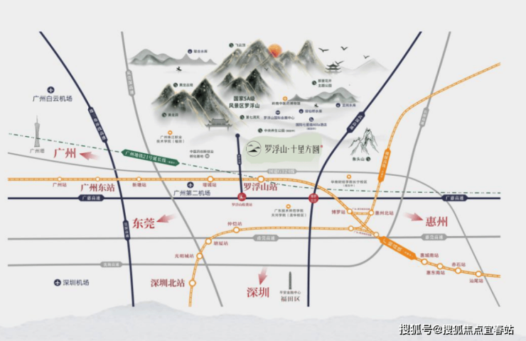 罗浮山·十里方圆项目距广汕高铁的罗浮山站仅500米,三站到广州东站,赣深高铁的规划使惠州到深圳仅需30分钟,山水城市,一键切换。
