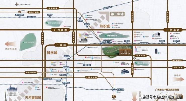 项目距地铁21号线中新站仅约500米,通过家门口的21号线,便可实现1站镇龙TOD、4站天河。而镇龙TOD,又可进一步握手“3地铁+1城轨+5高速”的超级路网,通过14号线可快速畅连黄埔、白云核芯区;搭乘新白广城轨,2站可达新塘,从知识城出发,到达白云机场仅3站,连接穗莞深城际直达深圳机场,快意纵横大湾区。