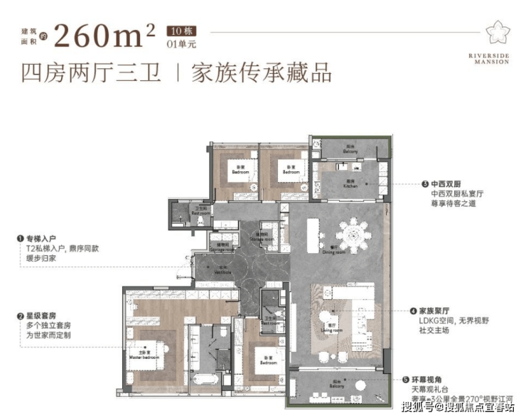 其最大的特点是采用了270°环幕方厅设计,提供了开阔的家族聚会和社交空间。
