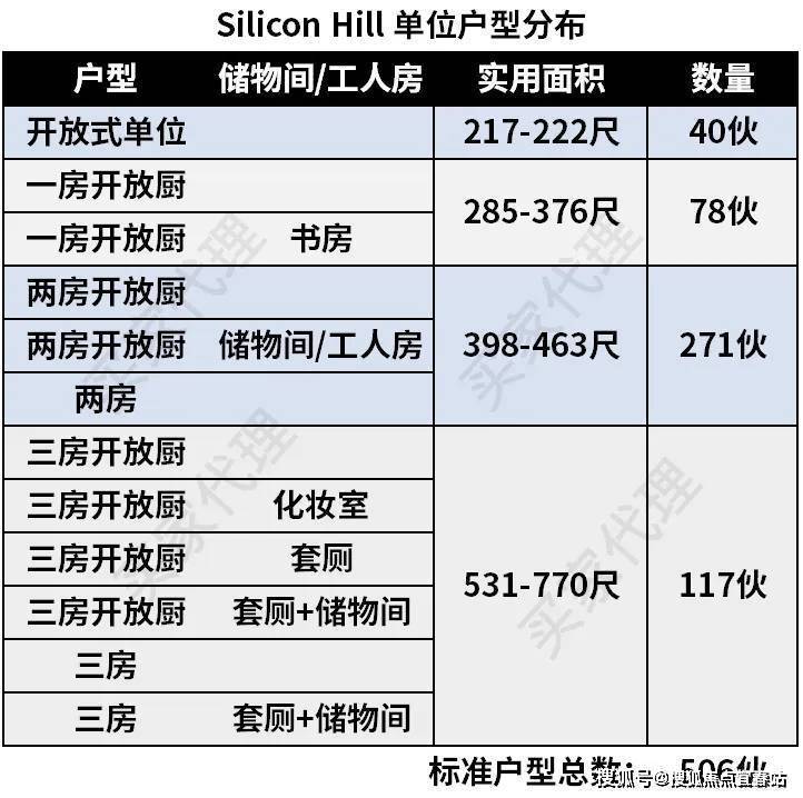 Silicon Hill 提供576伙住宅单位,户型覆盖开放式至三房单位,其中标准户型开放式单位实用面积217尺至222尺,共40伙,占总供应约7%。一房单位实用面积285尺至376尺,共78伙,占总供应约14%,两房单位实用面积398尺至463尺,共271伙,占总供应约47%。三房单位实用面积531尺至770尺,共117伙,占总供应约20%。