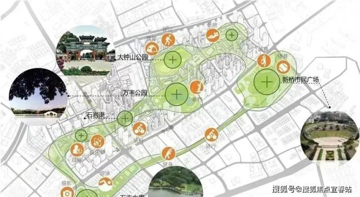 以新桥市民广场、大钟山,石岩渠、万丰水库。立新水库等绿色生态资源为基础搭建”生态绿环+城市绿芯”生态色框架,打造“线性公园”+“节点公园”公共开放空间体系,形成10公里生态绿环创造了片区居民多样化的居住休憩生活方式。
