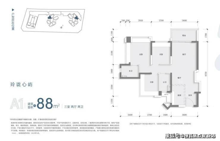 建面约88㎡三房两卫户型:打造约3.6m舒适宽厅;主卧套间双飘窗设计,次卧尺寸及方正度提升,两面凸窗满足2*1.2m床布置。