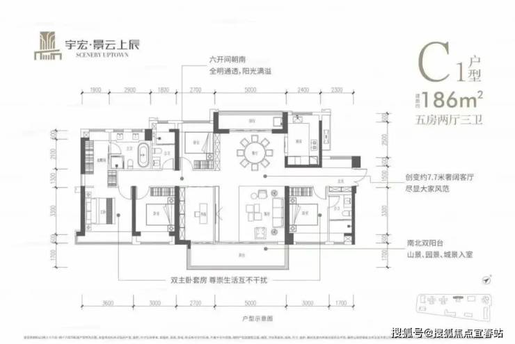 塔尖的186㎡五房两卫,六开间朝南,南北双阳台、主卧20㎡以上套房,得房率接近80%。