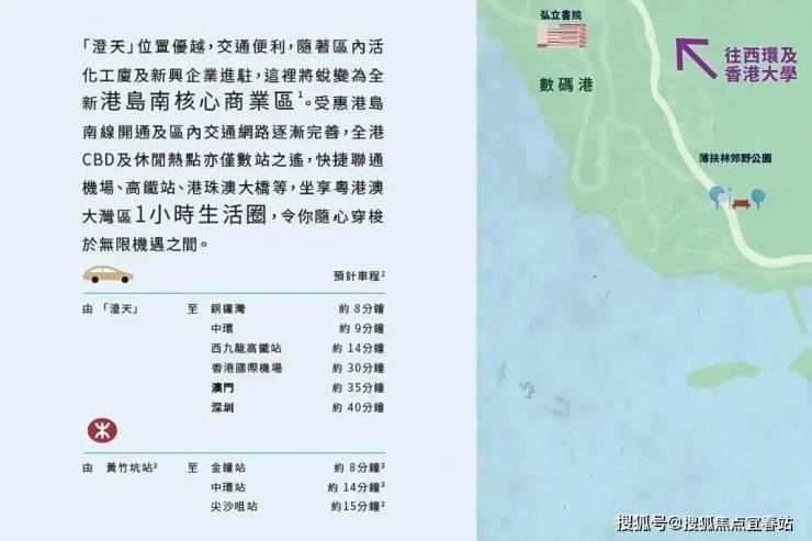位于港岛南区香港仔市中心,步行2分钟可达规划中的港铁南港岛线香港仔站(预计 2027 年动工,2032 年通车),未来15分钟可直达中环。当前依赖地面交通,湖南街、渔晖道等站点提供多条巴士及小巴线路,覆盖港岛、九龙及新界,驾车可通过香港仔隧道快速连接港岛东。项目邻近香港仔海滨长廊,兼具都市通达性与自然景观优势。
