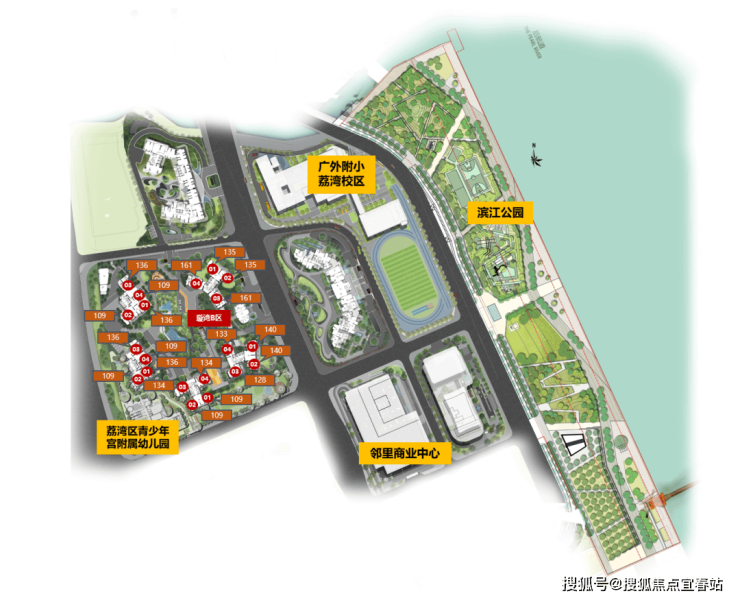 🔘广州滨江天地·璇湾,为广州滨江天地第一期组团,总占地123653㎡,总建筑面积317811㎡,总计容面积约230000㎡(含小学),配建一所12班幼儿园(荔湾区少年宫附属幼儿园)及一所30班小学(广外附小荔湾校区)。