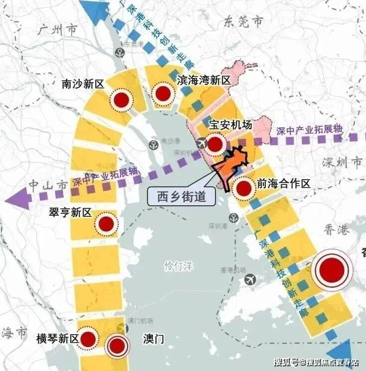 空中,不远处是宝安国际机场,也是空铁联运的大湾区枢纽;海上,靠近深圳机场码头,水路通达粤港澳;地面,深中通道、京港澳高速、广深沿江高速与城市主干道纵横交织;地下,地铁12/20/28号线、深大城际(建设中)、深江高铁(建设中)等地铁、城际、国铁三网交汇。