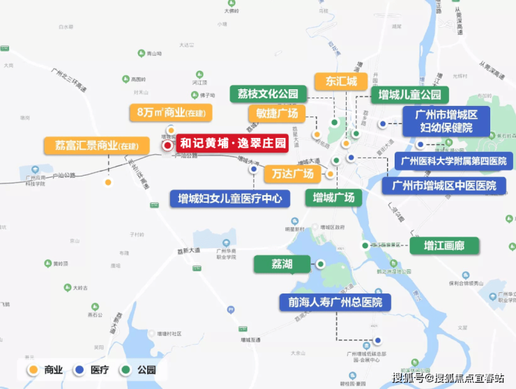项目周边覆盖有5家综合医院。其中,亚洲最大的三甲级广州市妇女儿童医疗中心增城院区与项目直线距离不到3km,预计今年年底便可投入使用。