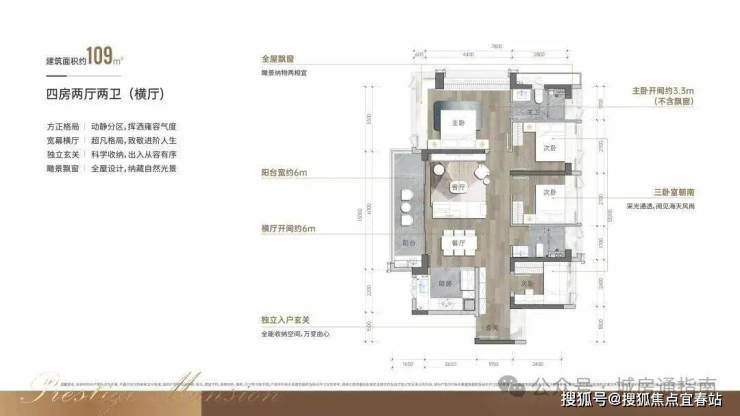 109㎡横厅四房:创新横厅设计,提升空间感与采光效果。