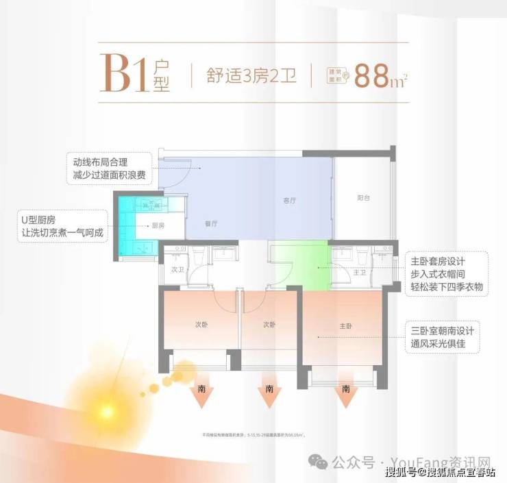 (1)三卧室朝南,全带大凸窗!(2)舒适主卧带衣帽间,一步到位!(3)U型大厨房,大客/餐厅,大阳台!(4)双卫浴,生活从容不迫!