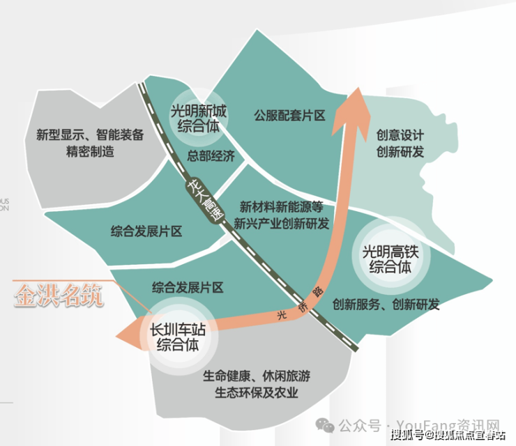 【金洪名筑核心价值点】世界一流科学城,凤凰城核心区,立享精粹醇熟配套光明科学城,中国版“硅谷”、大湾区科技创新“主引擎”。凤凰城片区,将打造成光明中央商务区、总部经济聚集区、超级商圈所在地。金洪名筑占据凤凰城“一环两轴三核”发展格局中的“一轴一核”(光侨路——创新产业发展轴;轨道长圳站节点——光明门户之核芯)。周边云集金洪大厦、招商智慧城、TCL华星光电等十余个科技产业园区,释放磅礴产业红利。