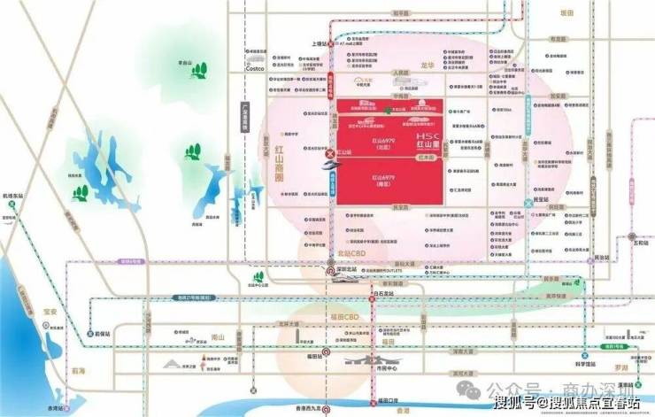 4、6号双地铁线红山站A1、A2、D1、D2出口双层无缝接驳项目;广深港高铁19分钟直达深圳北站,北站1站到项目;