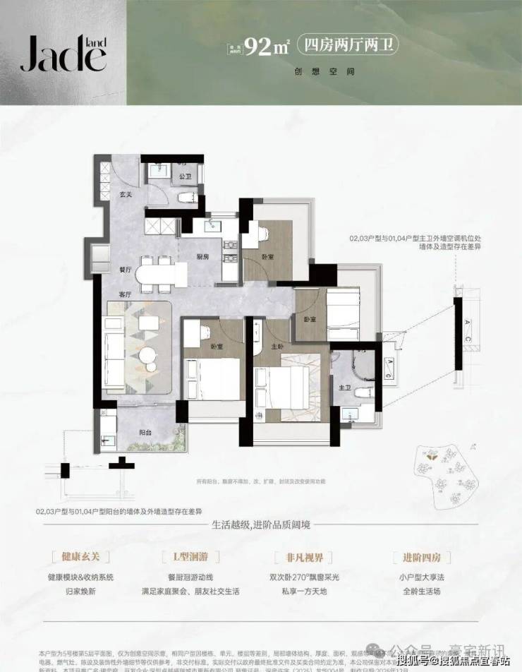 92㎡的4房2厅2卫,设计的是经典竖厅格局,进门入户玄关,客厅3.08米开间,LDKB一体化,S墙设计预留冰箱卡槽位,四开间朝南,有2个次卧270度飘窗,L型灵动式厨房,卫生间干湿分离,得房率约91.5%(包含赠送),东南朝向。
