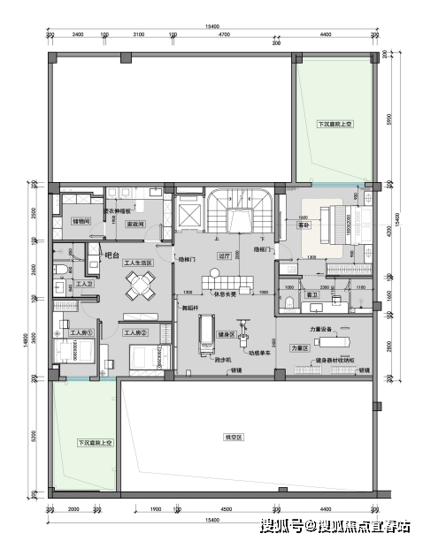 负一层下沉庭院周边环绕健身区、工人生活区与丰富储物空间;