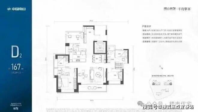 167㎡的5房2厅3卫,1栋02/2栋03高区户型,电梯入户送独立公区,设计的是竖厅双龙抱珠格局,四开间朝南,超宽敞客厅巨幕阳台,主卧大套间设计,U型厨房,双公卫三段式分离,得房率:72.07%(不含赠送),西南朝向。