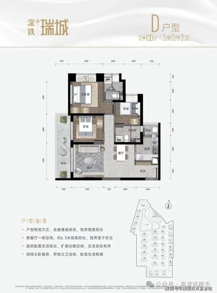 深铁瑞城,总占地面积约18.9万㎡,总建筑面积约64万㎡,计容建筑面积约57.7万㎡,容积率3.06,绿化率25%,项目共分3期开发,总规划4770户(其中商品房2770套,人才房606套,保障房1394套),停车位3202个(占比1:0.67)。