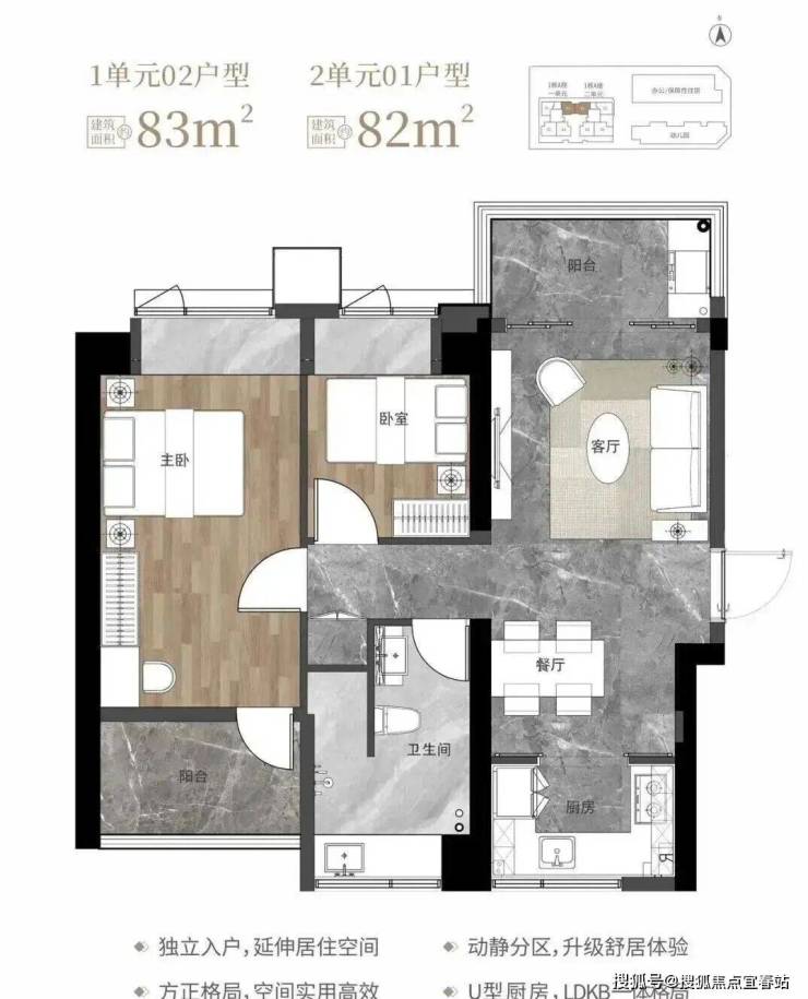 82-83㎡的3房2厅1卫,1栋1单元02户型/1栋2单元01户型,设计的是竖厅南北通透格局,独立入户,客厅3.2米开间,LDKB一体化设计,动静分区,南北双阳台,U型厨房,卫生间干湿分离,阳台正北朝向。