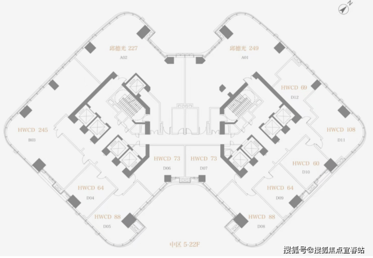 内部采用方胜纹双核心筒设计,提升建筑结构效率,实现双专梯入户,确保高端人群的私密性与高效通行。转角曲线设计拓宽建筑界面,强化空间开放感。