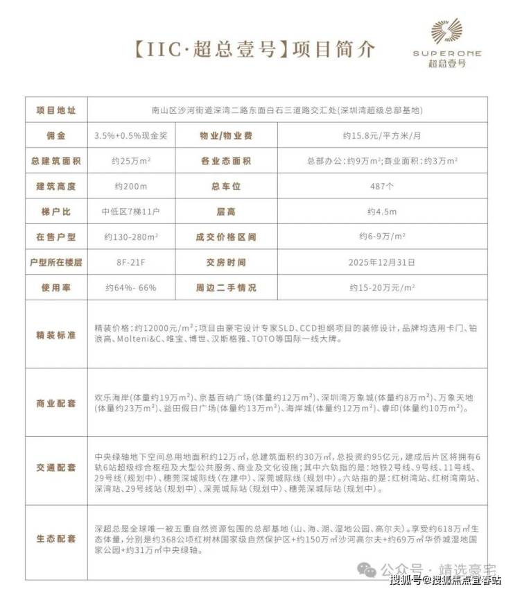深圳超总壹号(别名:IIC超总壹号)位于深圳湾超级总部基地,是集总部办公、总裁会馆、云端会客厅、商业于一体的生态综合体。项目总建筑面积约25万㎡,建筑高度约200米,拥有优越的生态环境和便捷的交通网络。作为深圳湾超级总部基地的核心组成部分,超总壹号以其独特的地理位置和高端的定位,成为深圳城市发展的新地标。