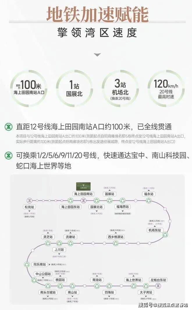 项目出门就是12号地铁线“海上田园南站”,步行约500米国展北站(12/20号线),5站到福永可换乘11号地铁线。可换乘1/2/5/9/11/20号线等多条线路,