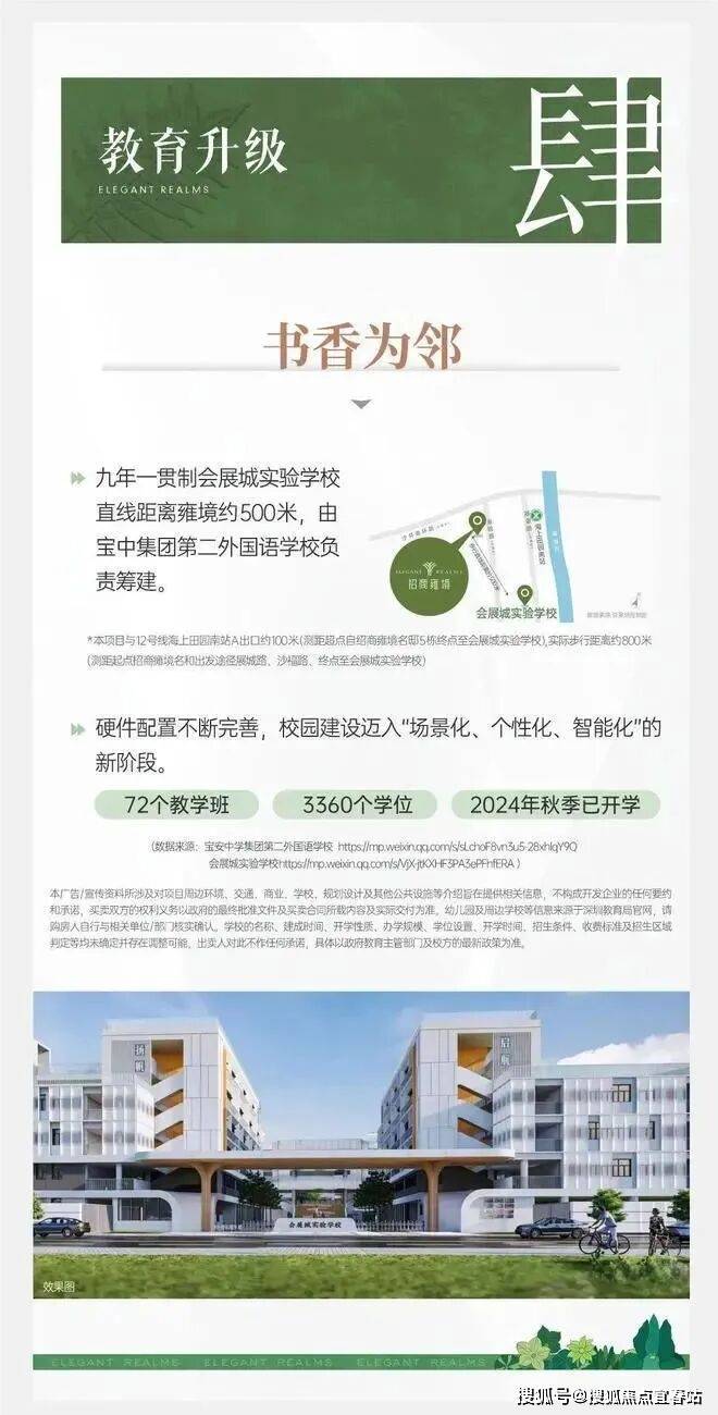 项目自带有1所9班制幼儿园,南侧约400米有会展湾实验学校,九年一贯制,72个班,3360个学位,由宝安中学(集团)第二外国语学校打造,去年9月份首次招生(小一录取积分96.8分,初一录取积分89.2分)。