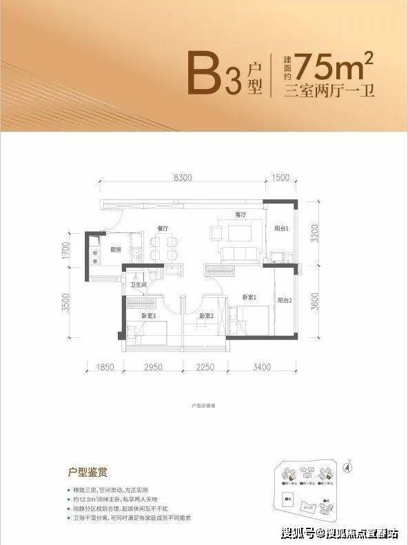 特点:LDKB一体化设计,主卧13.24㎡(含飘窗),次卧8.85㎡(含飘窗),次卧6.75㎡(含飘窗)。