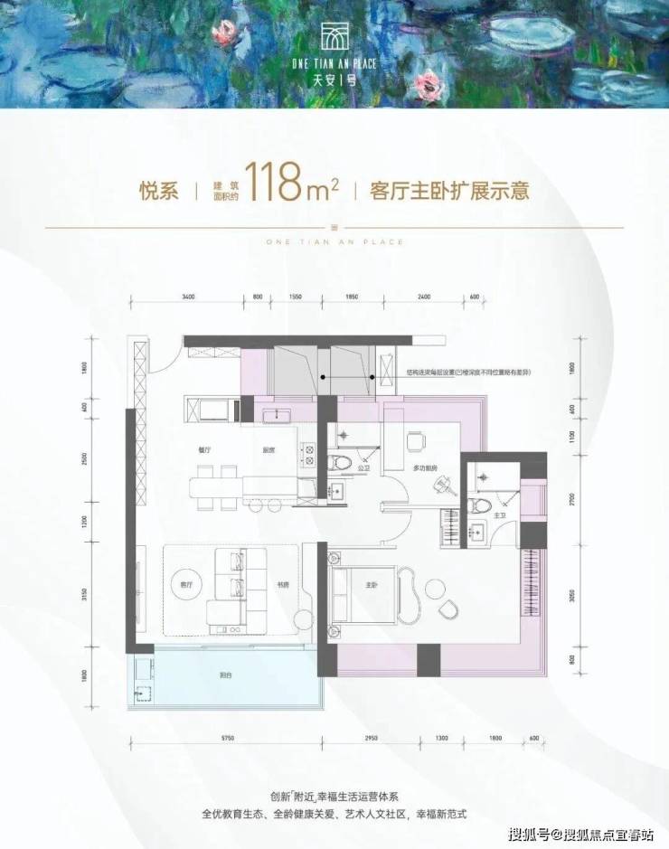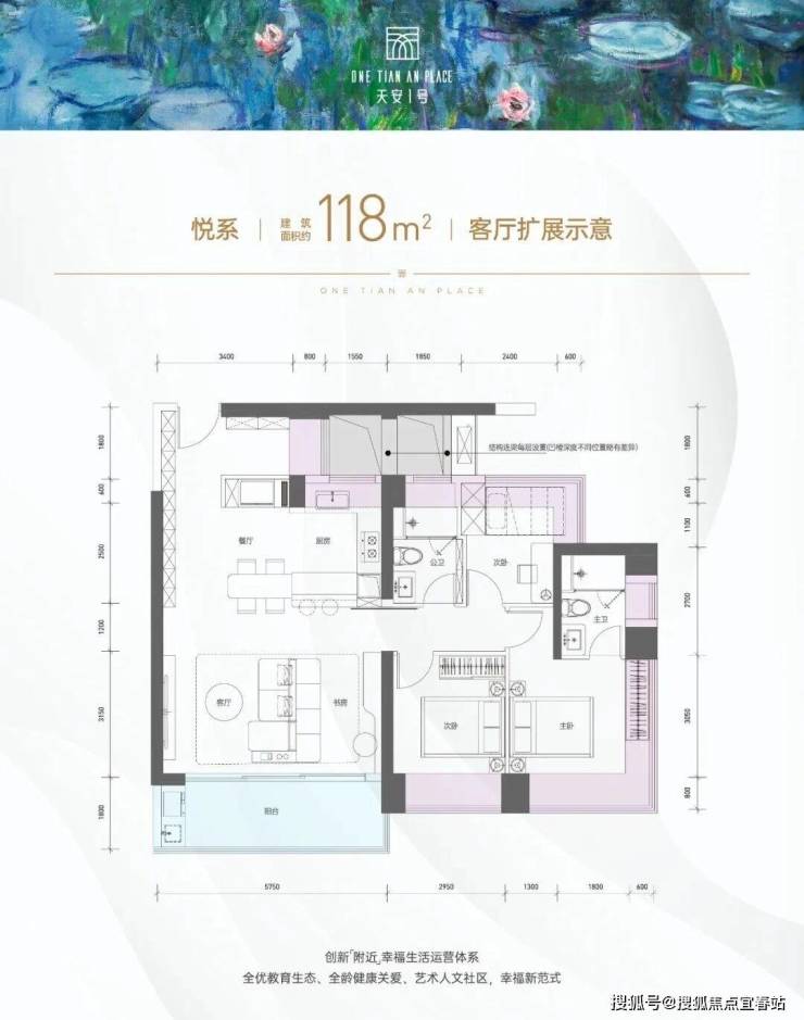 户型面积布局1118平三房两厅两卫设计的是竖厅格局,进门约6.12平的入户玄关位,客厅3.4米开间,LDKB一体化设计,四开间朝南,动静分区,分别做到了主卧15.67㎡/次卧11.35㎡/次卧8.46㎡/次卧7.4㎡(包含墙体飘窗),客厅连接次卧出5.75米长的大阳台约10.35平,U型厨房,公卫三段式干湿分离,得房率约96.5%(包含赠送),东南朝向。这个户型区别之处在于公卫,卧室,飘窗赠送面积14.31㎡+阳台赠送面积5.17㎡=实际赠送19.48㎡。户型亮点作为入门级改善户型,有3房和4房的选择,118㎡悦系在户型图中展现“客厅扩展示意”:通过拆除部分非承重墙,客厅开间从3.4米扩展至5.75米,形成约28㎡的家庭活动区,可容纳孩子玩耍、家人聚会等多场景。飘窗全赠送(进深800mm不计容),可实现“零公摊”效果,适配二人世界到三口之家的成长轨迹。多款灵动布局可选,满足个性化需求。