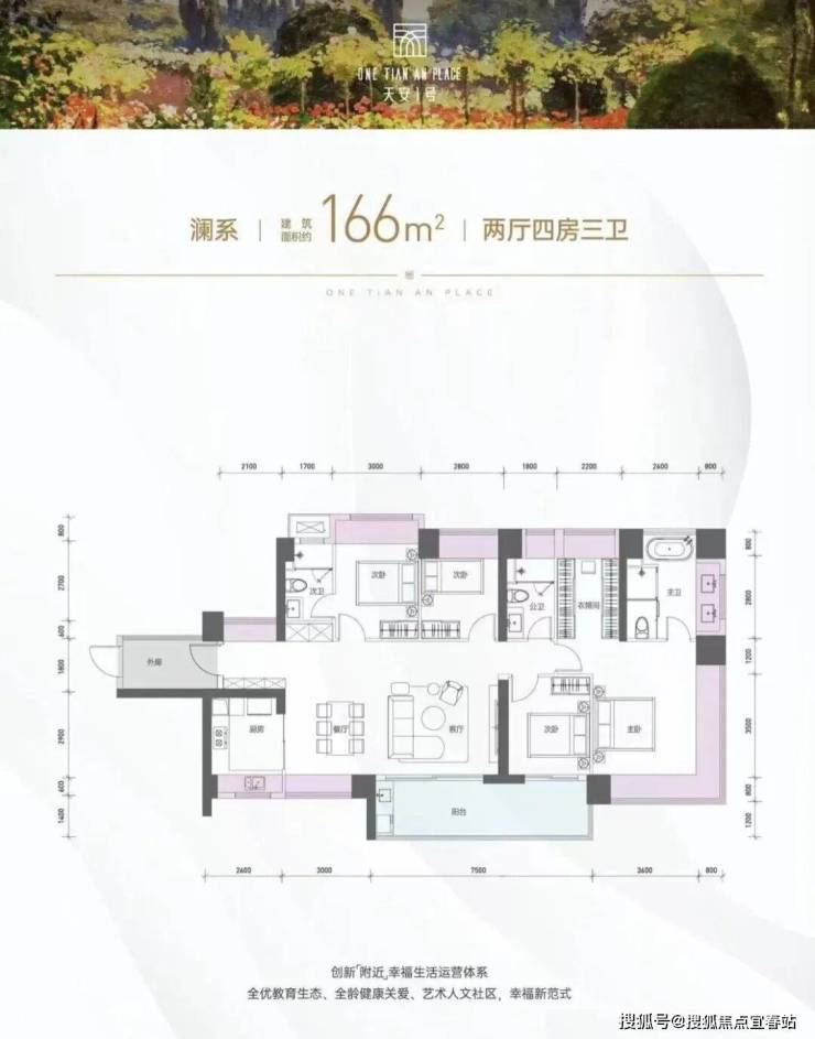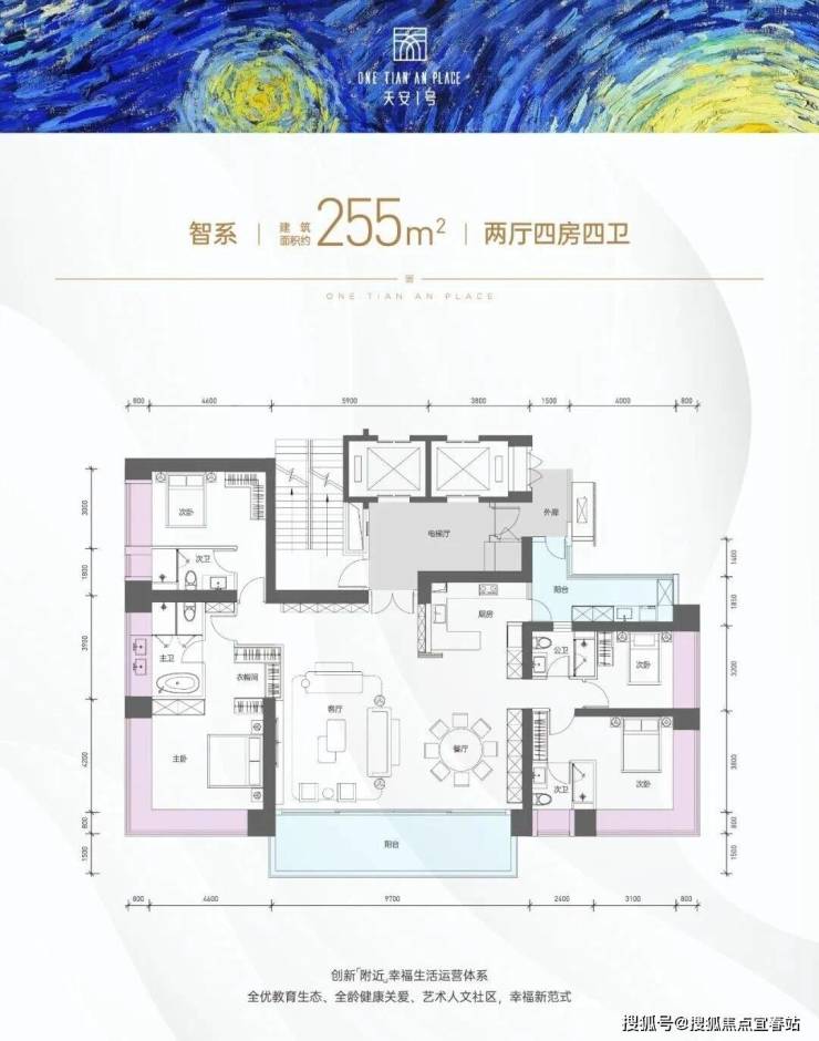 户型面积布局6255平四房两厅四卫设计的是竖厅双龙抱珠格局,专梯入户送超大私用入户空间,客厅9.7米开间,LDKB一体化设计,主卧带大衣帽间,三套房设计,分别做到了主卧34.02㎡/次卧24.18㎡/次卧18.3㎡/次卧15.16㎡(包含墙体飘窗),客厅连接餐厅出9.7米长的大阳台约22.31平,J型厨房带1个生活阳台约12.27平,卫生间干湿分离,得房率约96.7%(包含赠送,不含入户空间),西南或东北朝向。飘窗赠送面积24.8㎡+阳台赠送17.29㎡=实际赠送42.09㎡(不含电梯入户空间)。户型亮点255㎡智系作为天安1号楼王产品,以十字轴线布局实现家政与访客动线、主佣动线双重分离,保障居住私密性与秩序感。户型拥有约9.7米阔绰开间,搭配3.3米层高,空间感显著升级。