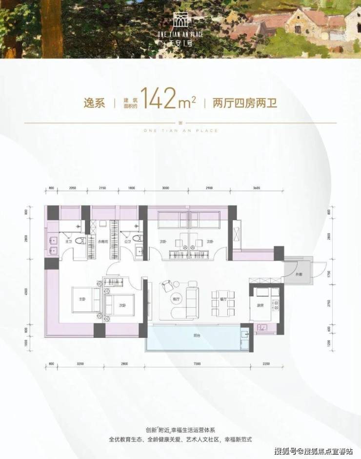 户型面积布局4142平四房两厅两卫设计的是横厅南北通透格局,独门独户,赠送约3.32平的入户空间,客餐厅7.3米开间,LDKB一体化设计,五开间朝南,主卧带大衣帽间,分别做到了主卧30.05㎡/次卧11.76㎡/次卧10.8㎡/次卧10.44㎡(包含墙体飘窗),客厅连接餐厅出7.3米长的大阳台约13.14平,U型厨房,卫生间干湿分离,得房率约103.95%(包含赠送),西南或东南朝向。飘窗赠送面积24.12㎡+阳台赠送6.57㎡+外廊赠送3.32㎡=实际赠送34.01㎡。户型亮点142㎡逸系是项目主力户型,采用独立玄关+主卧套房设计。客厅开间7.3米、主卧面宽3.6米,搭配3.15米层高,空间感开阔;南北通透格局下,明厨明卫确保通风采光。关键细节如主卧独立衣帽间+主卫双台盆、次卧嵌入式衣柜,均体现“实用主义美学”,使用率近100%,成为追求均衡品质家庭的首选。