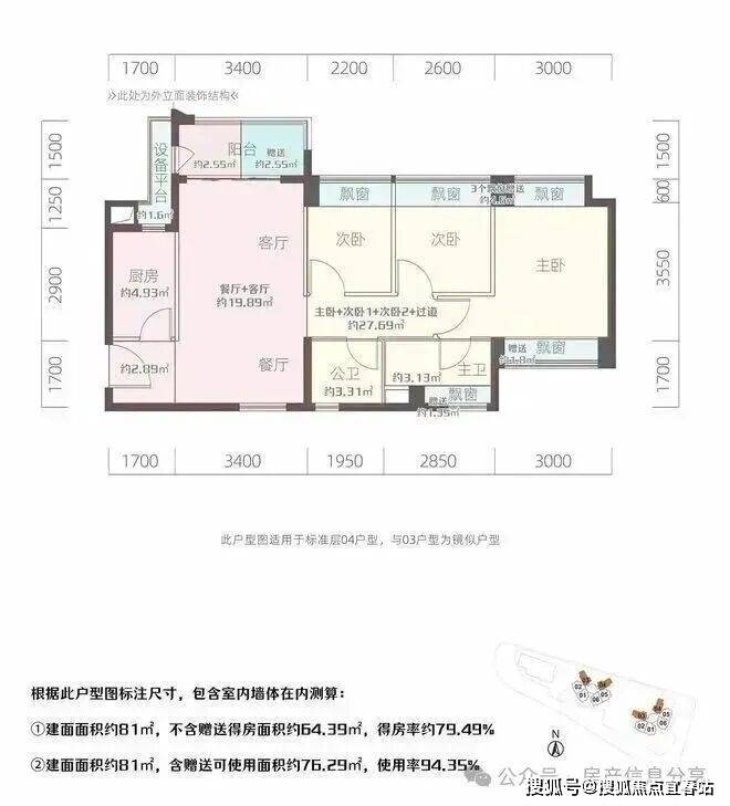 81㎡的3房2厅2卫,设计的是竖厅南北通透格局,客厅3.4米开间,3个卧室分别是3米/2.6米/2.2米的宽度,L型厨房,得房率:94.35%(包含赠送),阳台西北或东北朝向。