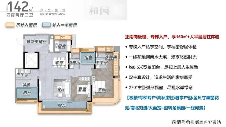 142方,2梯2户+独梯入户的设计,将私密性拉满,厅出阳台即是花地河水景,双主卧大面积+8.5m宽景阳台的设计满足多使用场景,北阳台可望花地河水景,南飘窗可望园林,景色全览。