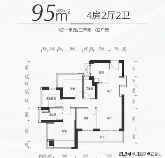 95㎡的4房2厅2卫,设计的是竖厅格局,进门独立玄关,LDKB一体化,S墙设计预留冰箱卡槽位,主卧双飘窗设计,客厅连接次卧出6米长的大阳台,L型厨房,卫生间干湿分离,得房率约97%(包含赠送),西南朝向。