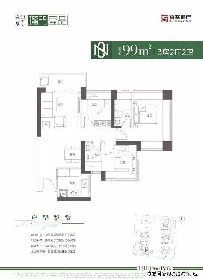 99㎡的3房2厅2卫,设计的是经典竖厅格局,进门入户玄关,客厅3.9米开间,LDKB一体化设计,动静分区,四开间朝南,主卧三面飘窗,U型厨房,卫生间干湿分离,得房率:71.29%(不含赠送),东南朝向。