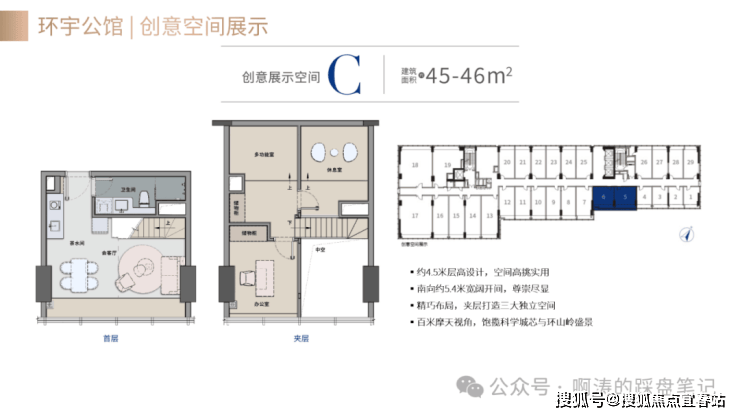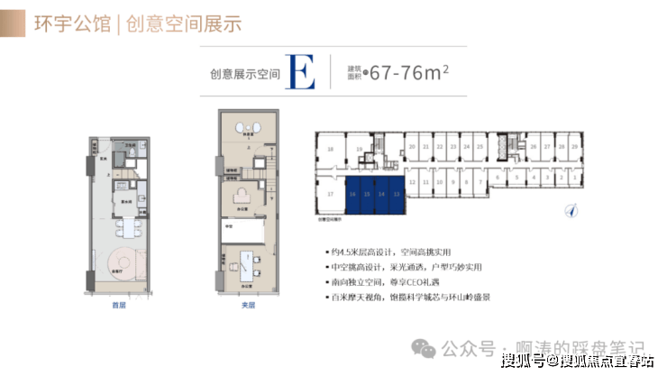 建面约32-142㎡环宇公馆,具备百米摩天视角,南向望环山岭公园生态景观,北向饱揽科学城芯繁华大境,视野开阔,产品层高约4.5米,雅装交付,一步到位,轻松入驻,整体空间宽敞舒适宜人,百变高拓空间,满足业主不同使用需求。
