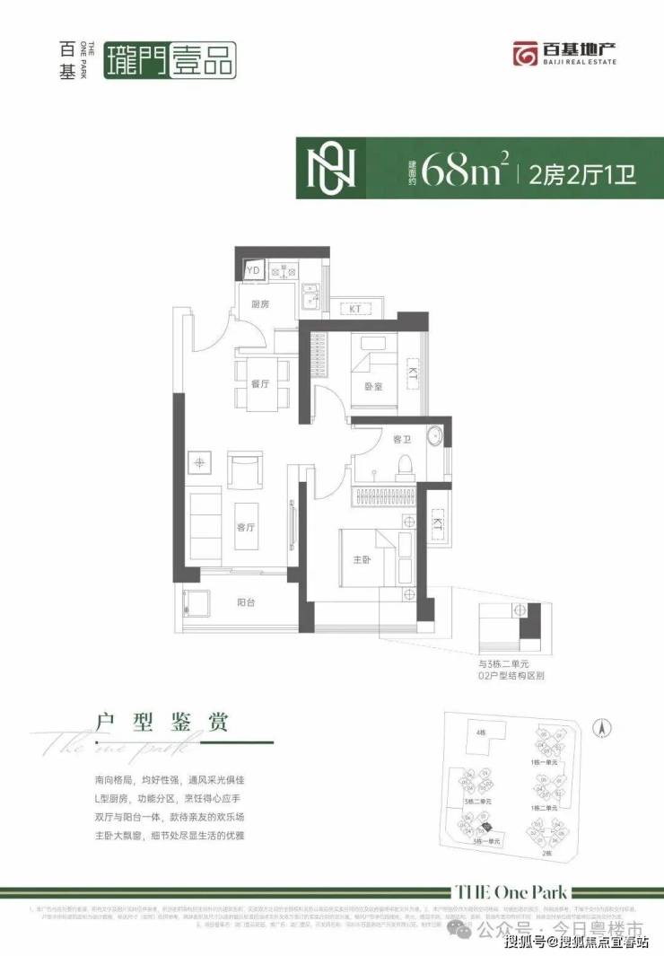仅3栋1单元02户型,设计的是竖厅格局,客厅3.4米开间,LDKB一体化设计,L型厨房,卫生间干湿分离,东南朝向。