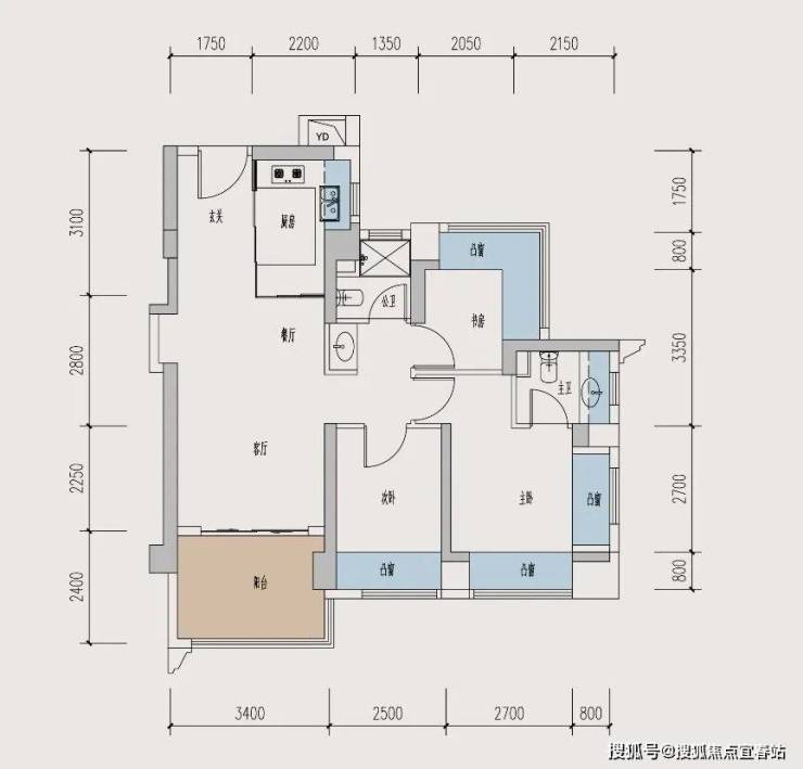 超8㎡宽敞阳台,突出于楼体,可以双面观景。这个户型布局,很有改善的味道,但面积段还是硬控在90㎡以内。
