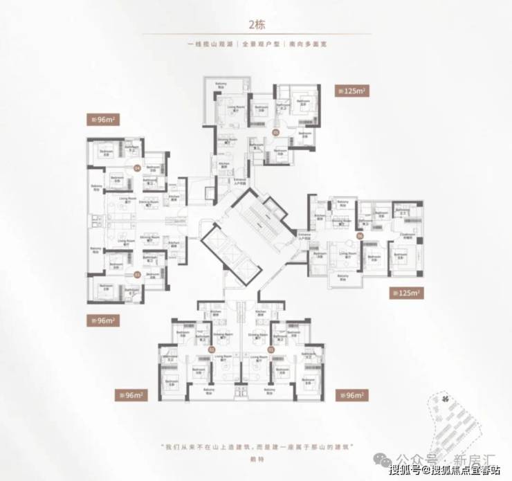 125㎡四房两厅两卫:以私属入户花园为特色,设有13㎡的L型阳台,为居住者提供一线湖山景观。主卧3.3米全景飘窗,卧室与景观自然融合,为住户带来极佳的视觉享受。
