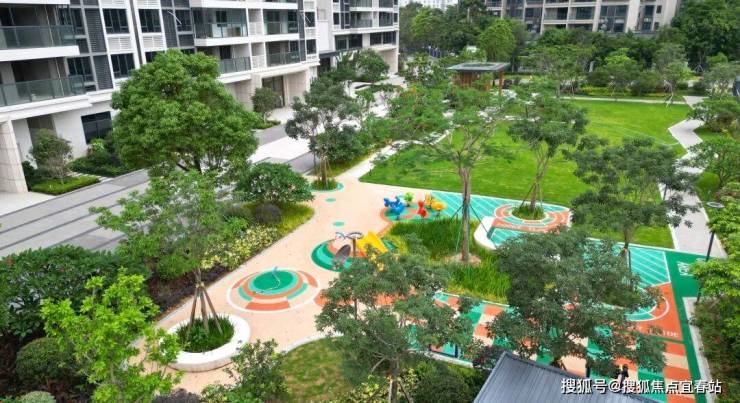 小区园林已经成型,一目了然的大颗绿植、大片绿地、儿童休闲设施、凉亭等等。