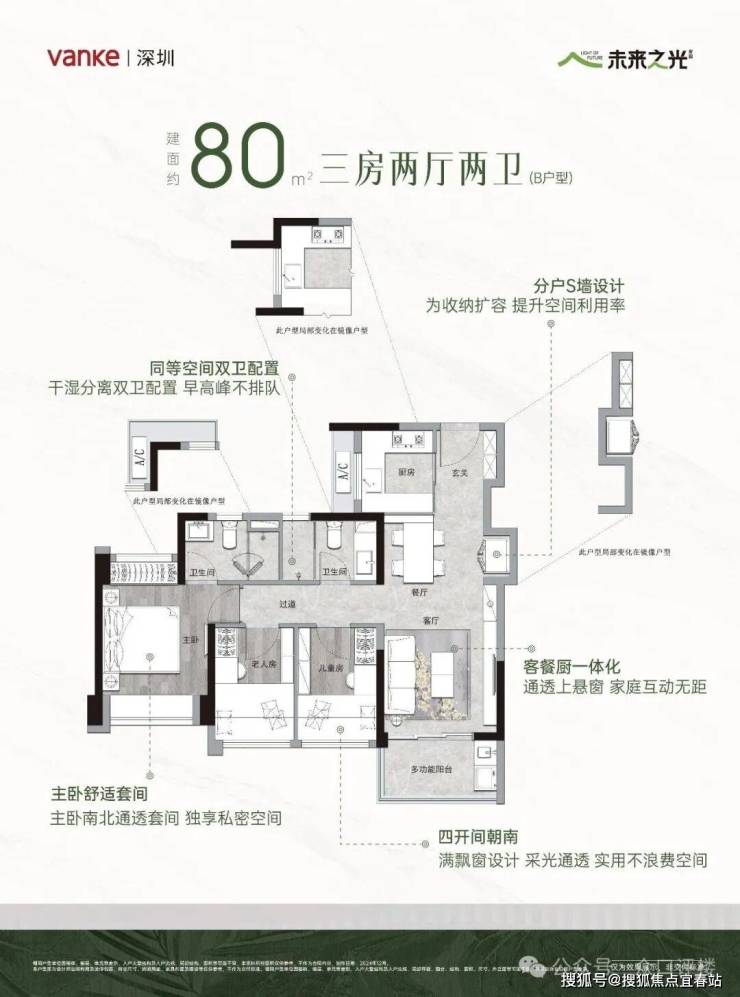 建面约80㎡B户型3房2卫