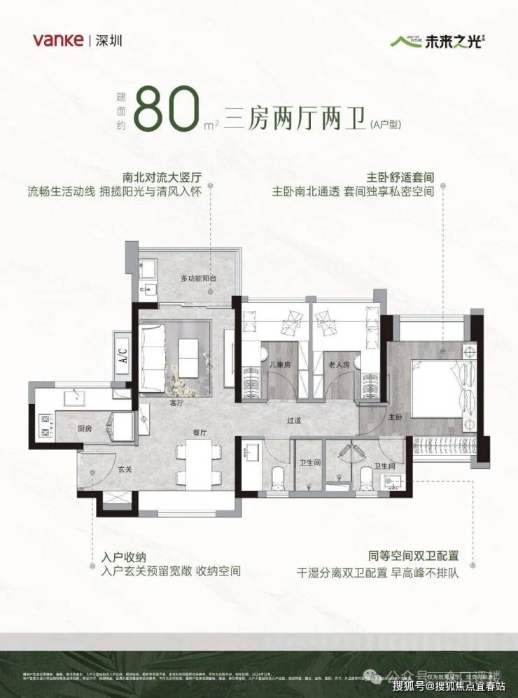建面约80㎡A户型3房2卫